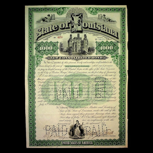 State of Louisiana Bond Certificate from 1892 Signed By Mayor Murphy J. Foster