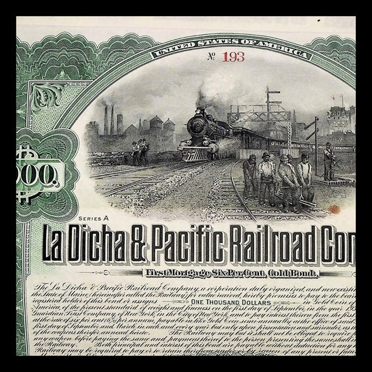 La Dicha & Pacific Railroad Company Uncanceled Gold Bond – 1906 (Coupons Attached)