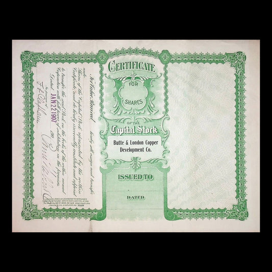 Butte & London Copper Development Co Stock Certificate from 1907 (Montana)