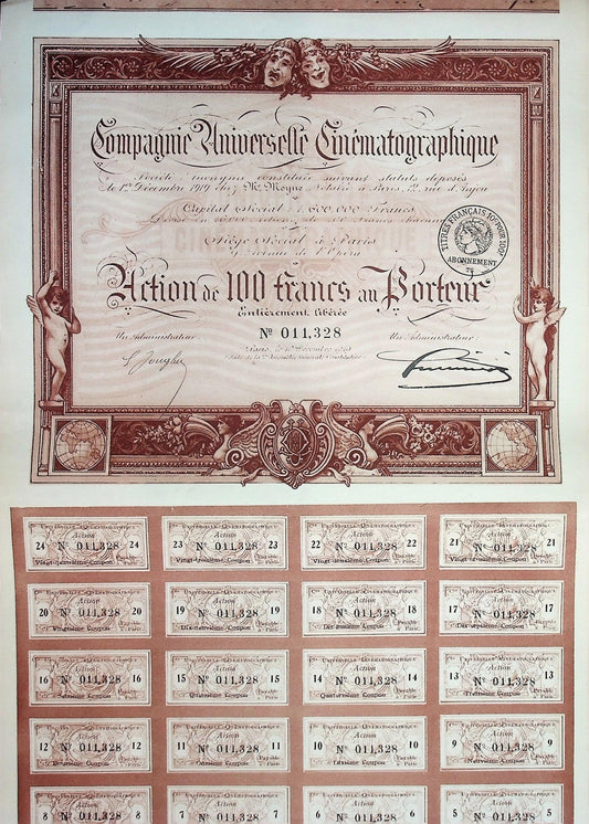 Compagnie Universelle Cinématographique 1910 Film Bond Certificate from France (King Kong, The Three Musketeers)