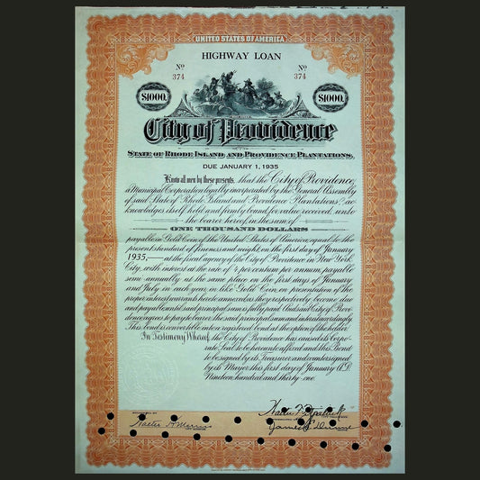 City of Providence, Rhode Island $1,000 Highway/ Water Loan Bond from 1915/ 1930