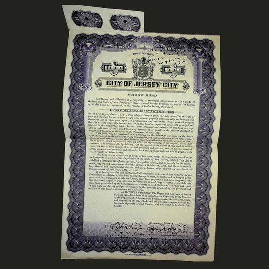 City of Jersey City School Bond Certificates from 1910s-1920s
