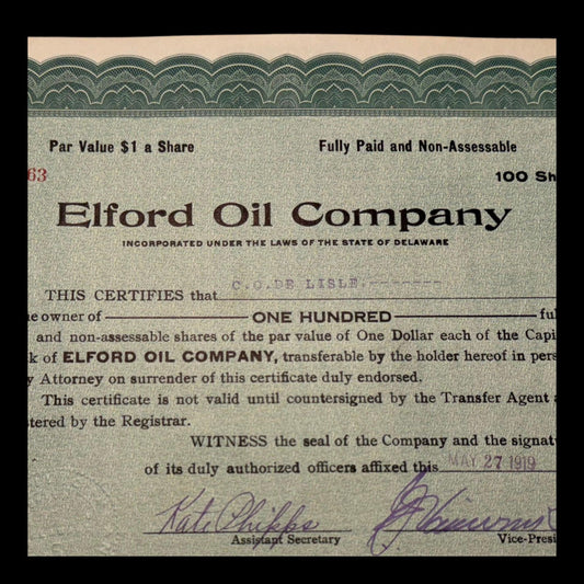 Elford Oil Company Stock Certificate from 1919