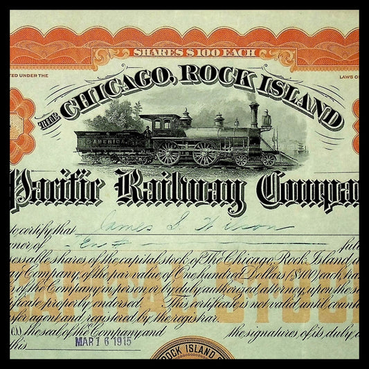 Chicago, Rock Island and Pacific Railroad "Rock Island Line" Company Stock Certificate from 1915