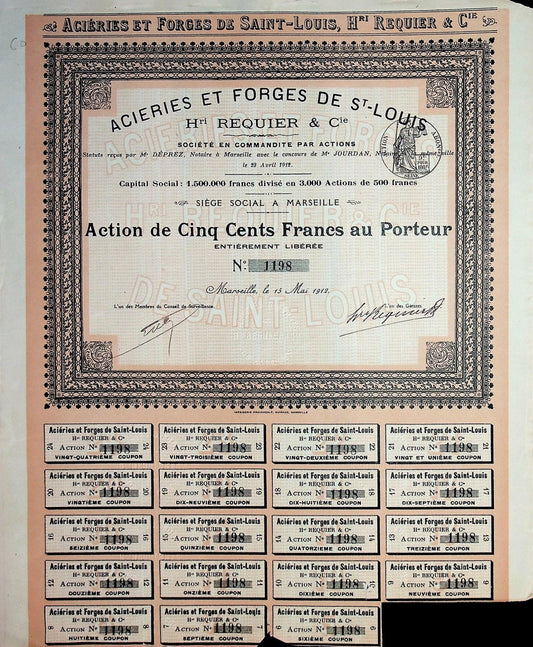 Aciéries et Forges de Saint-Louis Bond Certificate (Marseille, France) 1912