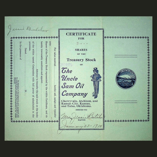 Uncle Sam Oil Company Stock Certificate signed by Henry Harrison Tucker Jr (early Ponzi) from 1914