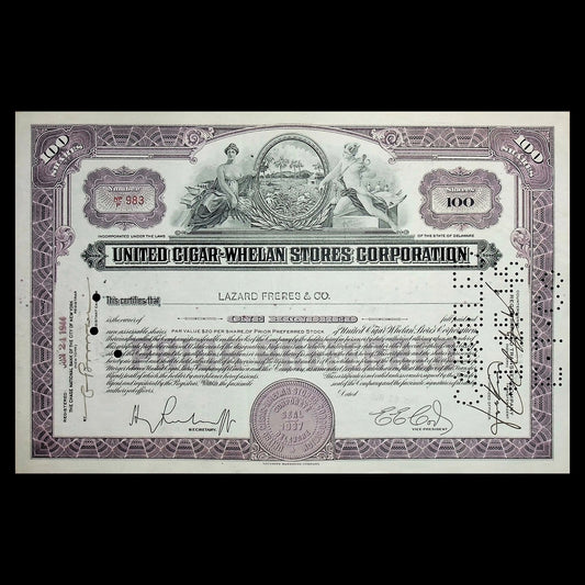 United Cigar-Whelan Stores Corporation Stock Certificate from 1940s