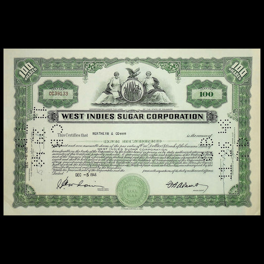 West Indies Sugar Corporation Stock Certificate from 1940s