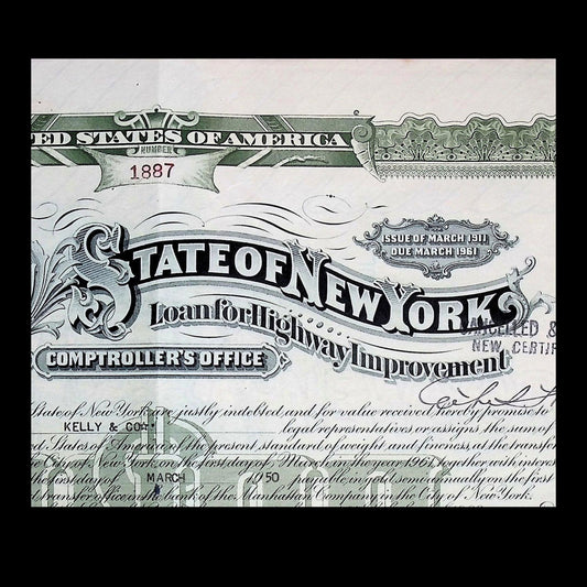 State of New York Loan for Highway Improvement Bond Certificate from 1940/50s