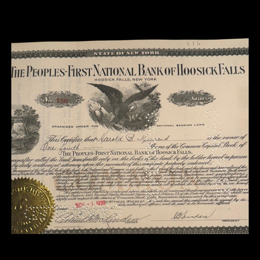The People's First National Bank of Hoosick Falls (New York) Stock Certificate from 1953