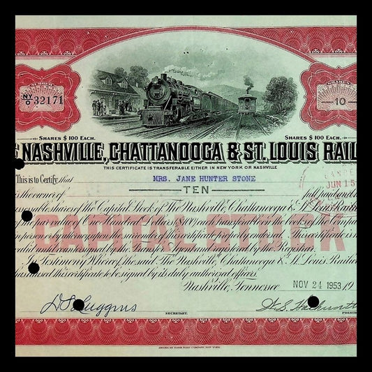 The Nashville, Chattanooga & St Louis Railway (now CSX) Stock Certificate from 1950s