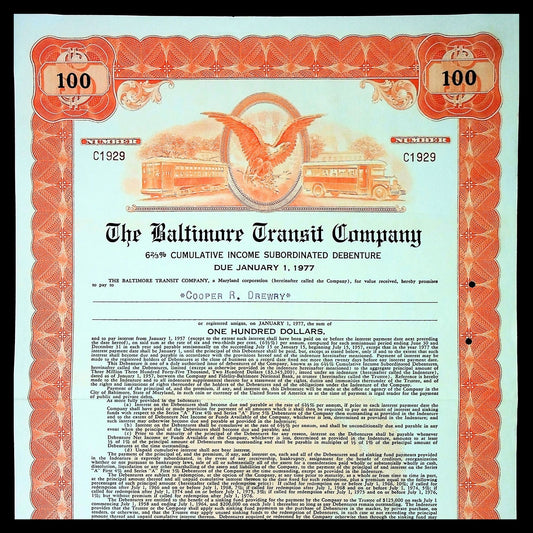 The Baltimore Transit Company Bond Certificate from 1950s