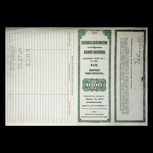 Chicago, Burlington and Quincy Railroad (Zephyr) Company Bond Certificate 1960s