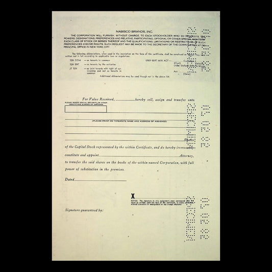Nabisco Inc, Unissued Stock Certificate from 1980s