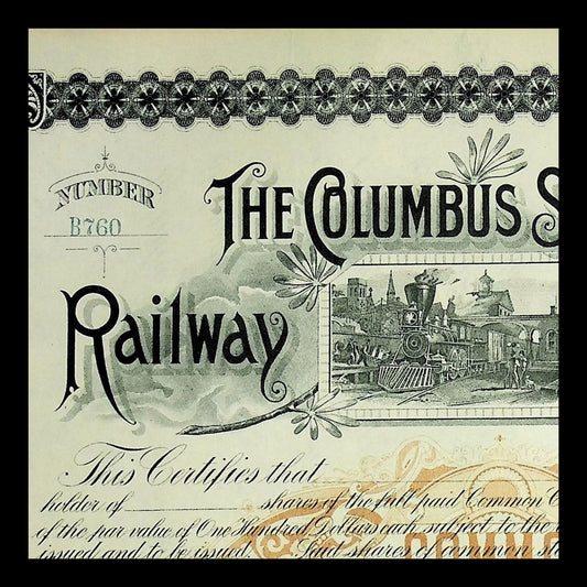 The Columbus Southern Railway Company Unissued Stock Certificate from 1800s