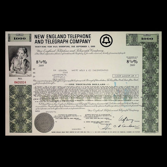 New England Telephone and Telegraph Company Stock Certificate from 1970s – Multi-Color