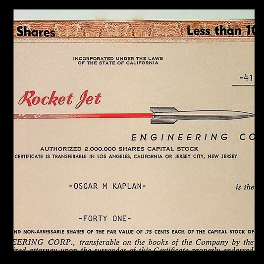 Rocket Jet Engineering Stock Certificate from 1960s (with a rocket on vignette!)