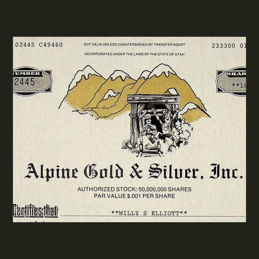 Alpine Gold & Silver Inc Stock Certificate from 1986