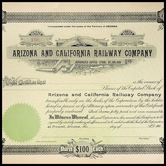 Arizona and California Railway Company Stock Certificate early 1900s