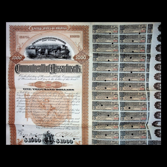 Commonwealth of Massachusetts Bond Certificate from 1896 with Coupons