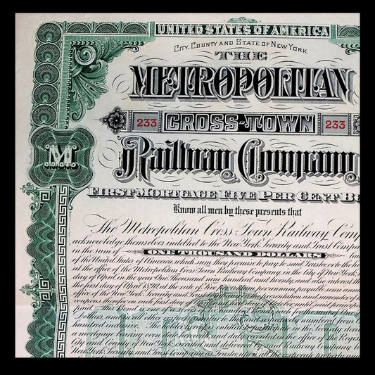 Metropolitan Crosstown Railway New York City Uncanceled Bond Certificate 1900s (with Coupons)