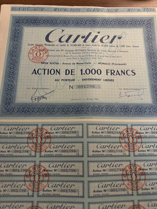 Cartier (Jeweler) Stock Certificate from 1943 - Luxury Jewelry