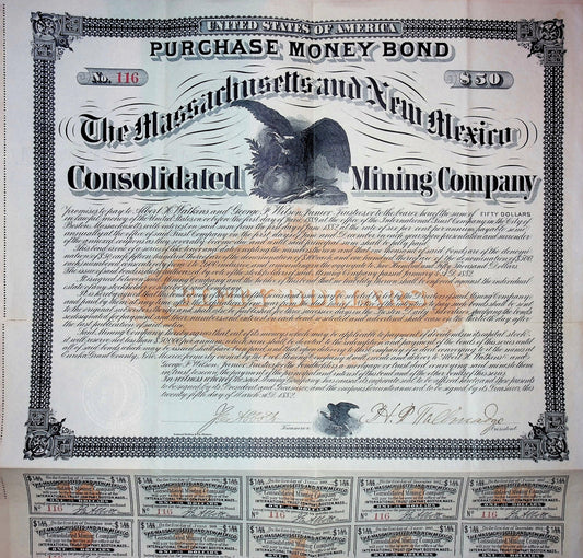 Massachusetts & New Mexico Consolidated Mining Company Bond Certificate 1882