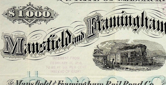 Mansfield & Framingham (Massachusetts) Railroad Company Bond Certificate - Rare from 1870s
