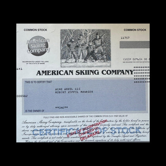 American Skiing Company Stock Certificate (feat photo of Skiers)