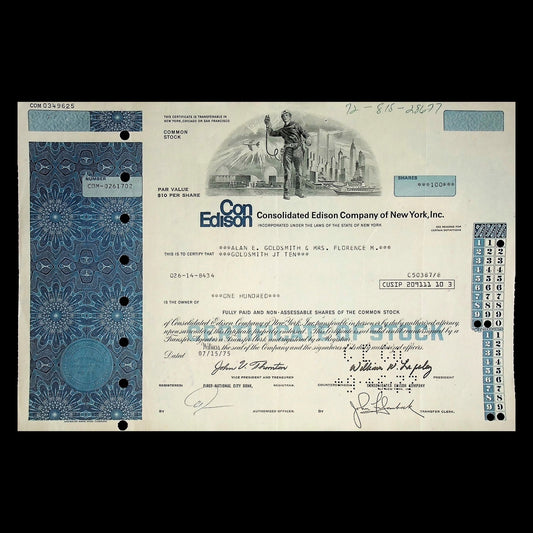 ConEd (Consolidated Edison Company of New York) Stock Certificate - Featuring Twin Towers / NYC Skyline