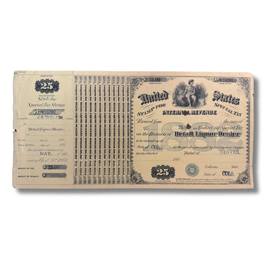 IRS Retail Liquor License Dealer Certificate from 1870/80s