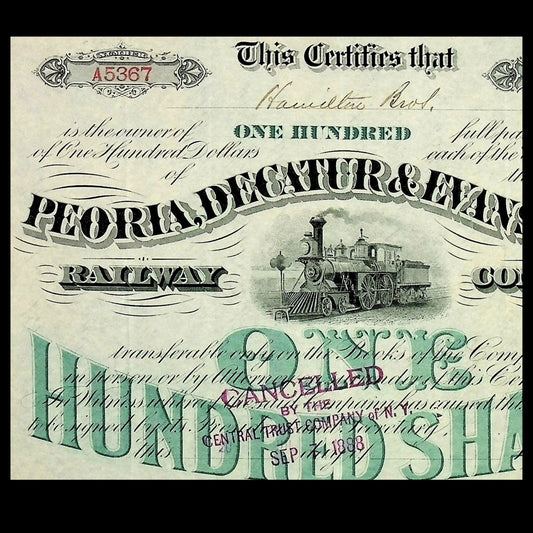 Peoria, Decatur & Evansville Railway Company Stock Certificate from 1880s