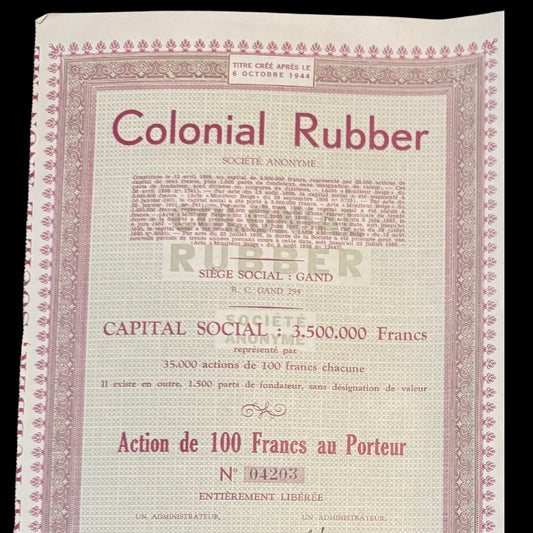 Colonial Rubber Stock Certificate 1944 from Gand (Ghent), Belgium