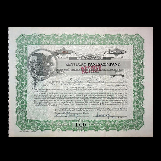 Kentucky Pants Company, Inc Stock Certificate from 1940s/50s