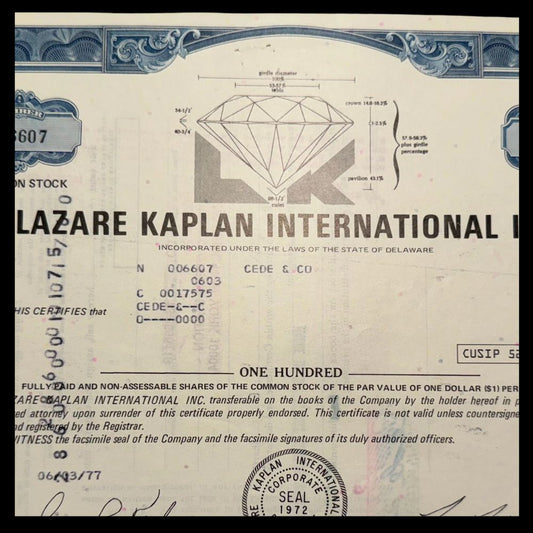 Lazare Kaplan International Inc Stock Certificate (features a diamond) from 1970s
