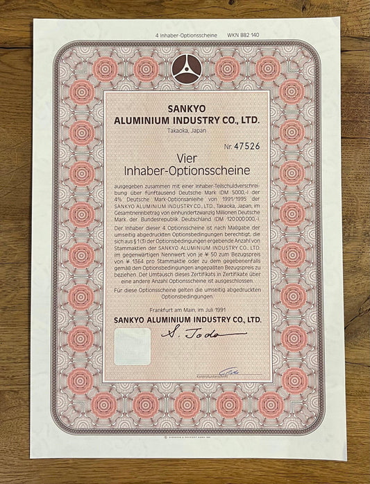 SUMINOE Textile Co, Ltd (Japan) German Warrant Certificate from 1988