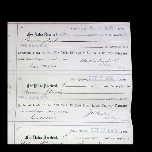 New York, Chicago & St. Louis Railway Stock Transfer Receipts (sheet of 4x) from 1885