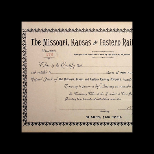 The Missouri, Kansas and Eastern Railway Company Unissued Stock Certificate from 1890