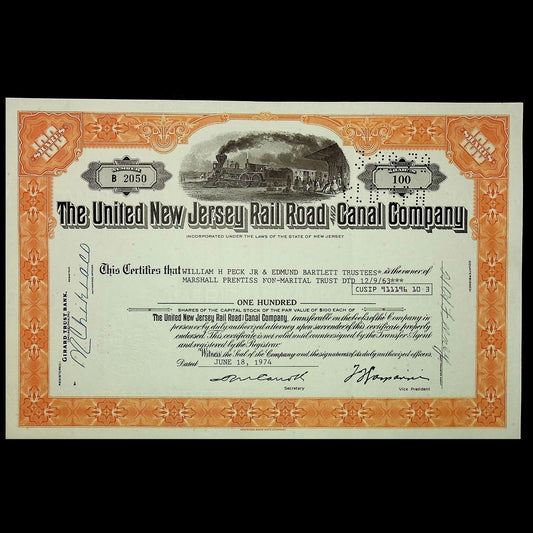 United New Jersey Rail Road and Canal Company (Now NJ Transit) Stock Certificate