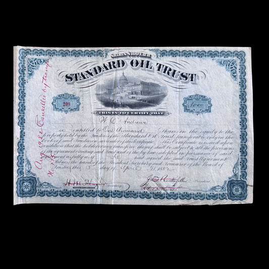 Standard Oil Trust Stock Certificate signed by John D Rockefeller and Henry Flagler from 1882