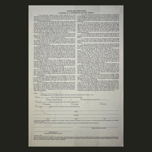 Citibank Gold Certificate - Unissued Certificate from 1930s