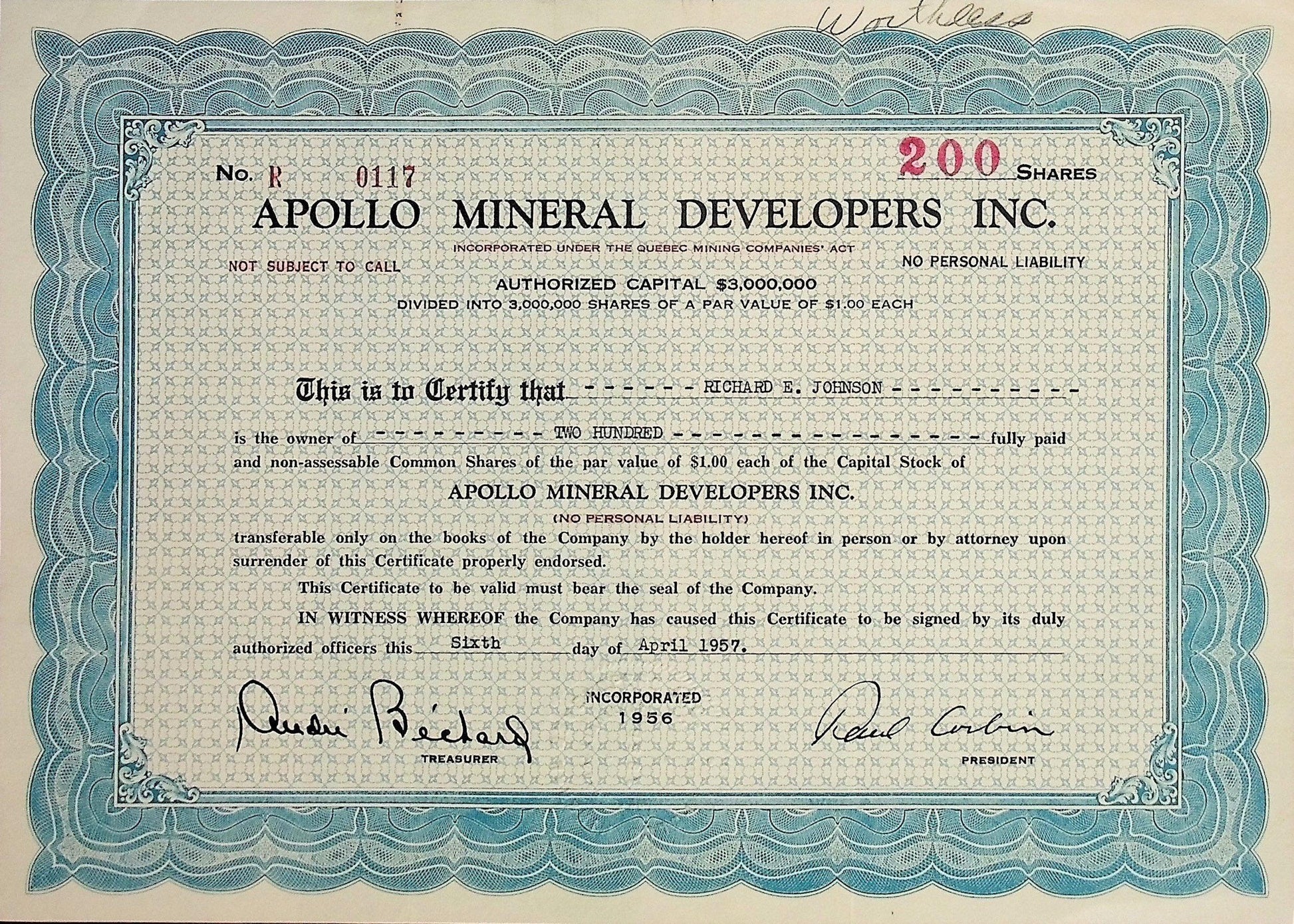 This is an Apollo Mineral Developers Stock Certificate, issued in 1957. This company was based in Quebec, Canada. In the color blue, crisp certificate. Perfect for Canadian & Mining collectors.