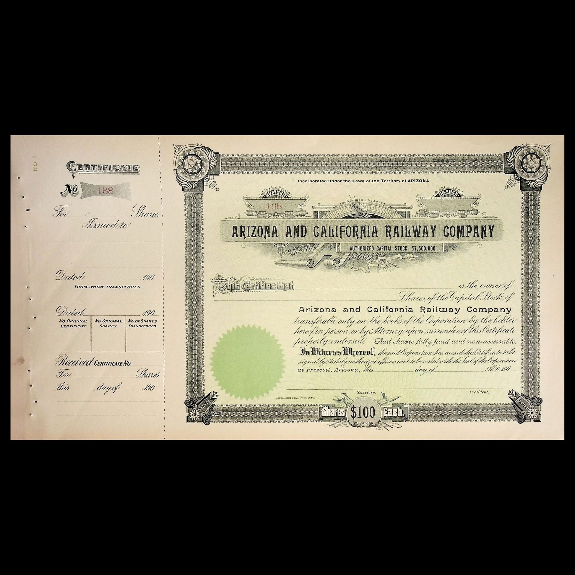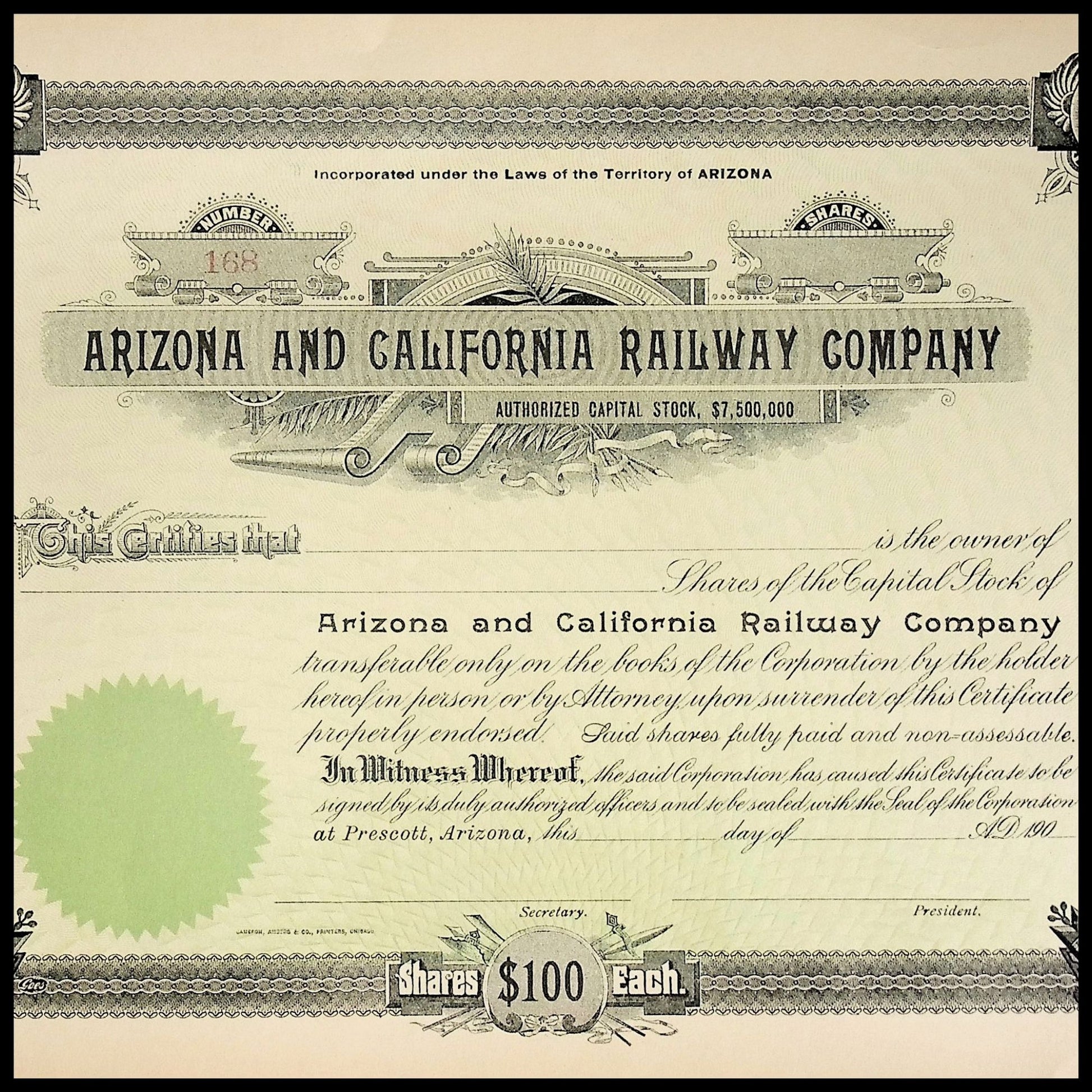 This is an unissued stock certificate from the Arizona and California Railway Company, dating to the early 1900s.It features a green border, remains blank and uncancelled, and includes the original left-hand stock stub still attached.
