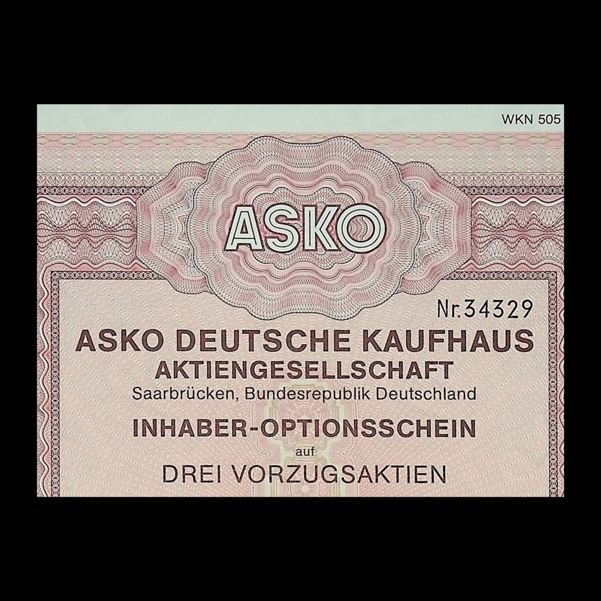 ASKO Deutsche Kaufhaus (German Dept Store) Warrant Certificate from Germany in 1986