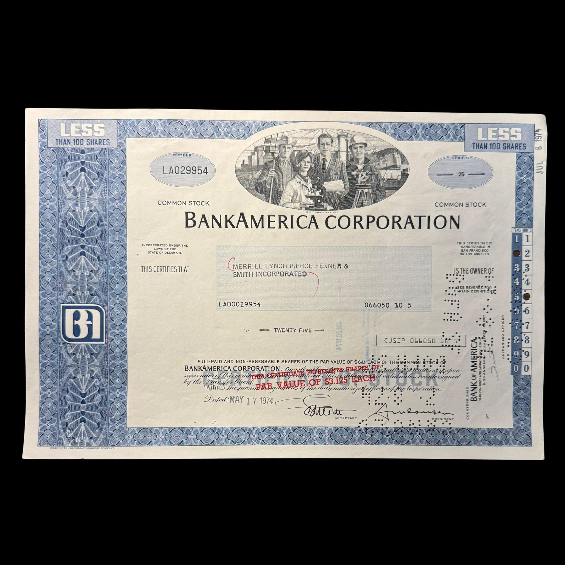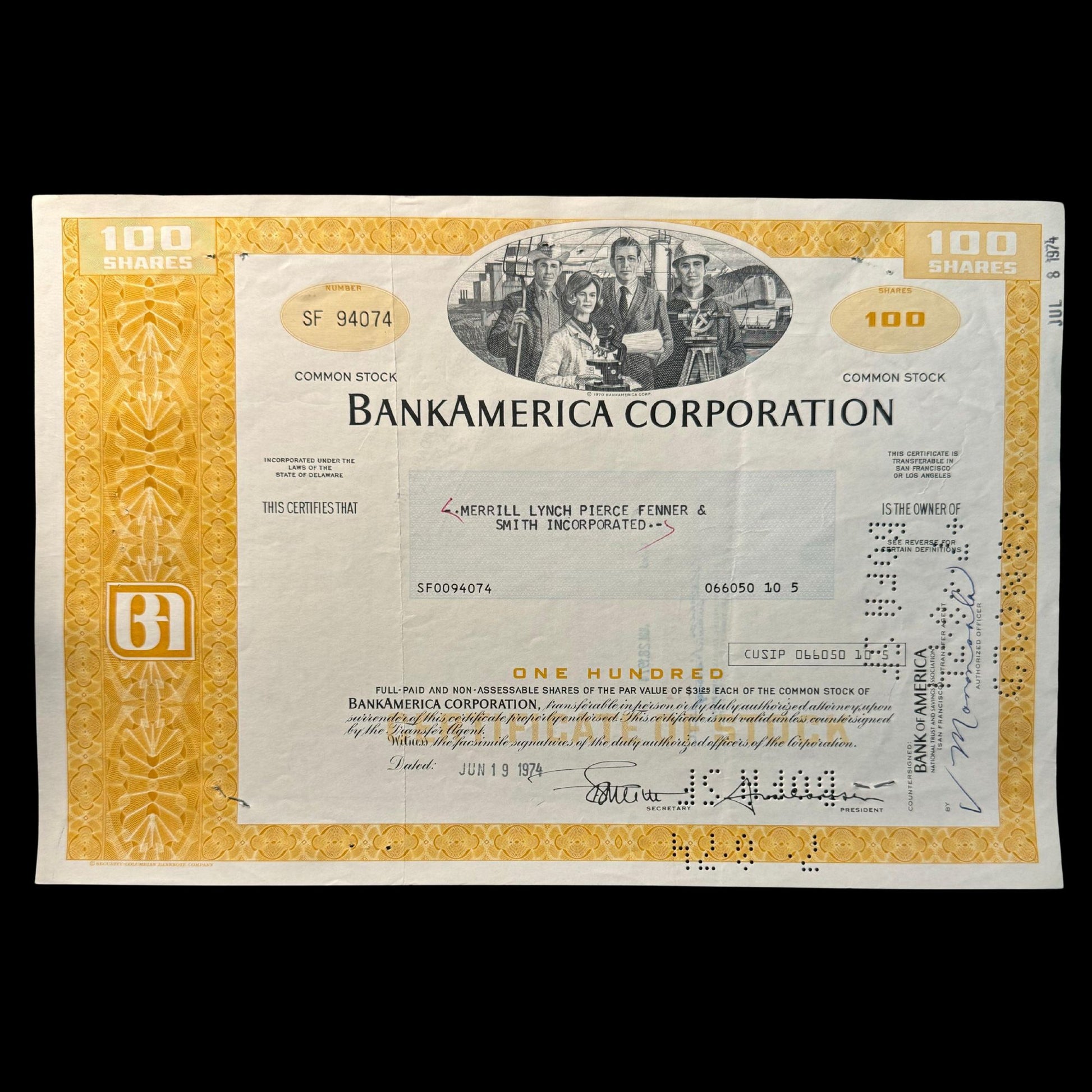 This is an original, crisp stock certificate from BankAmerica Corporation (now known as Bank of America) dated 1974. Cancellation holes and stamps present. Available in blue or yellow gold (limited). You will receive a certificate similar to the one shown.