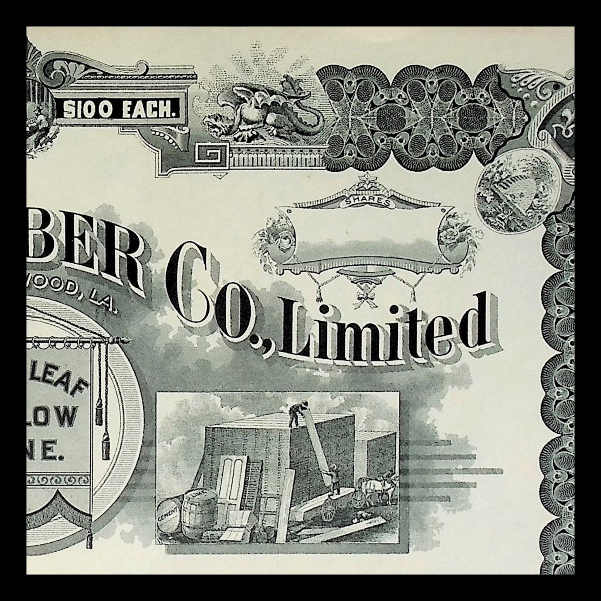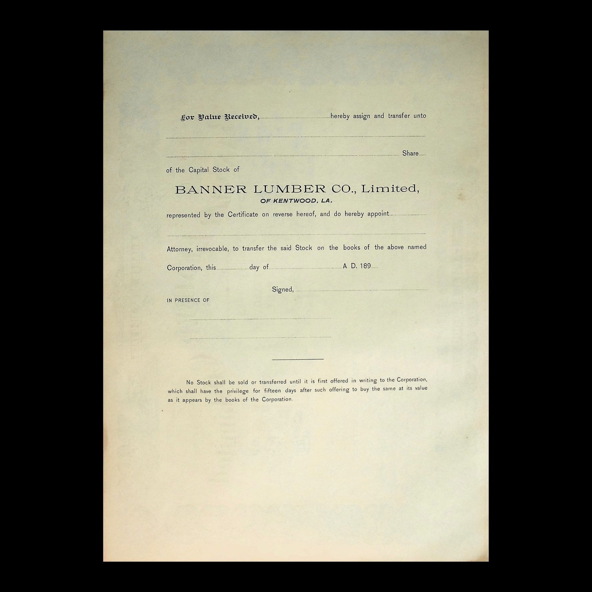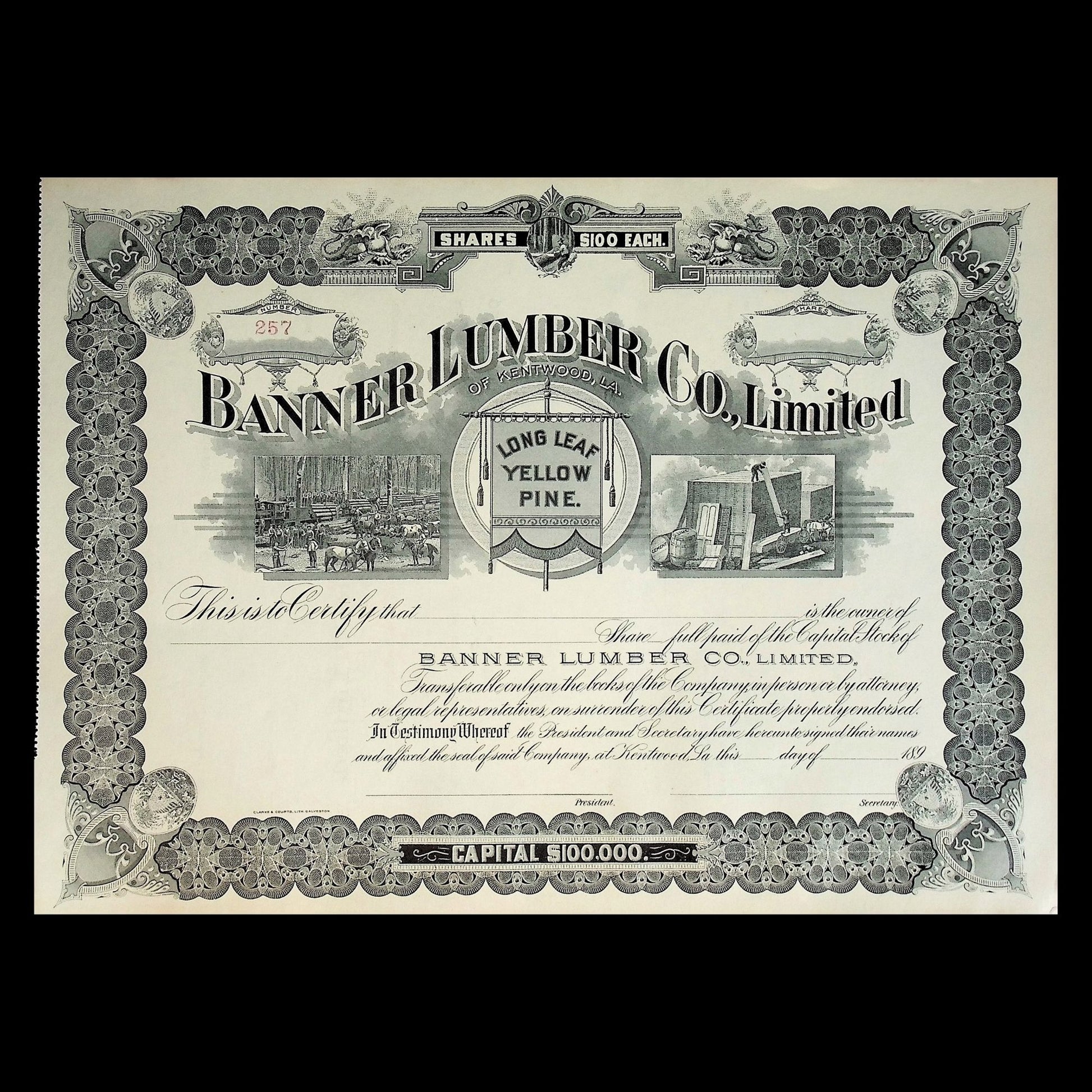Founded during a peak in industrial timber harvesting, Banner Lumber Company operated in the pine-rich forests of Louisiana, where longleaf yellow pine was in high demand for construction and railroads across the expanding U.S. Unissued and blank, this certificate remains clean and crisp, with ornate borders, typographic flourishes, and vivid imagery that speak to the scale and pride of the company’s operations.