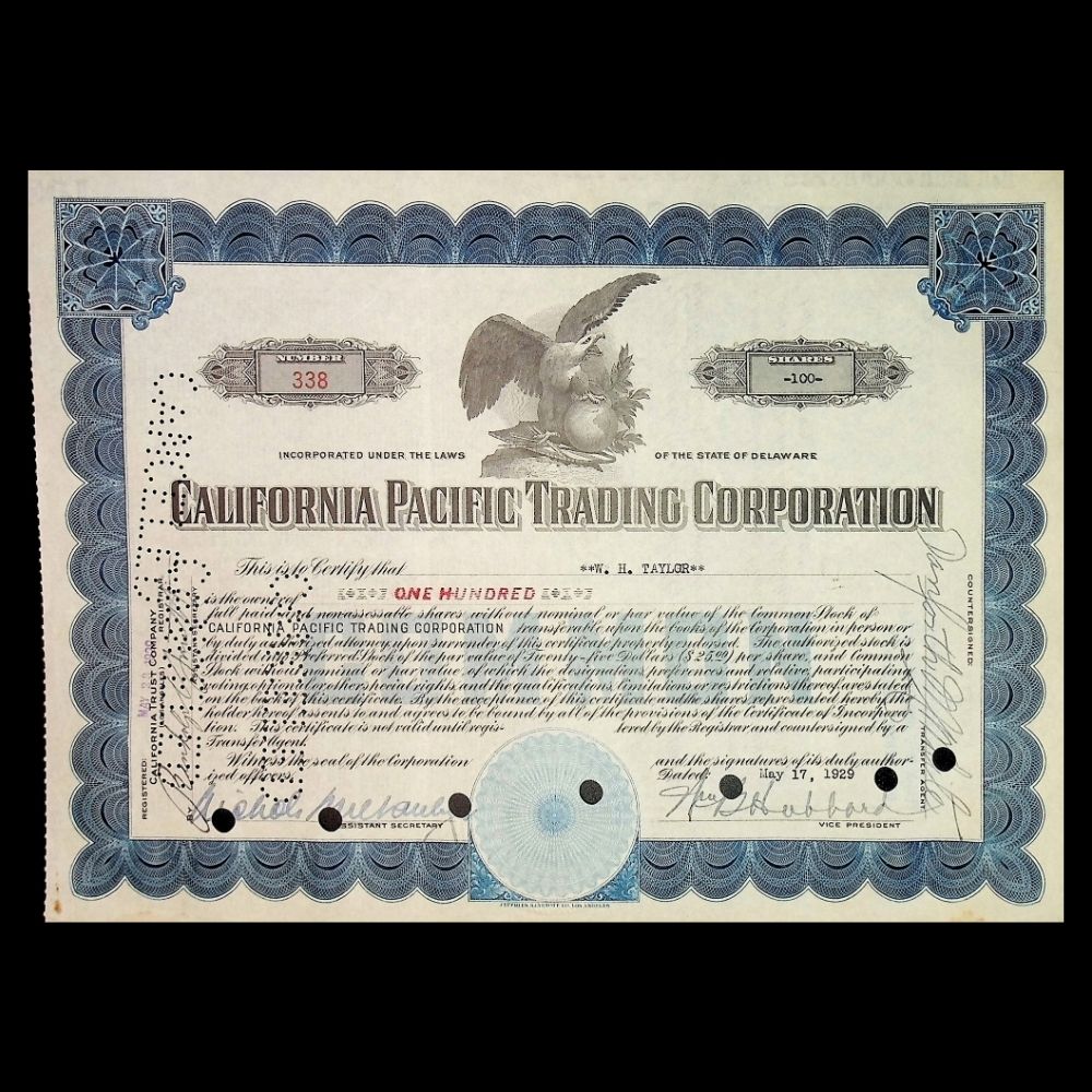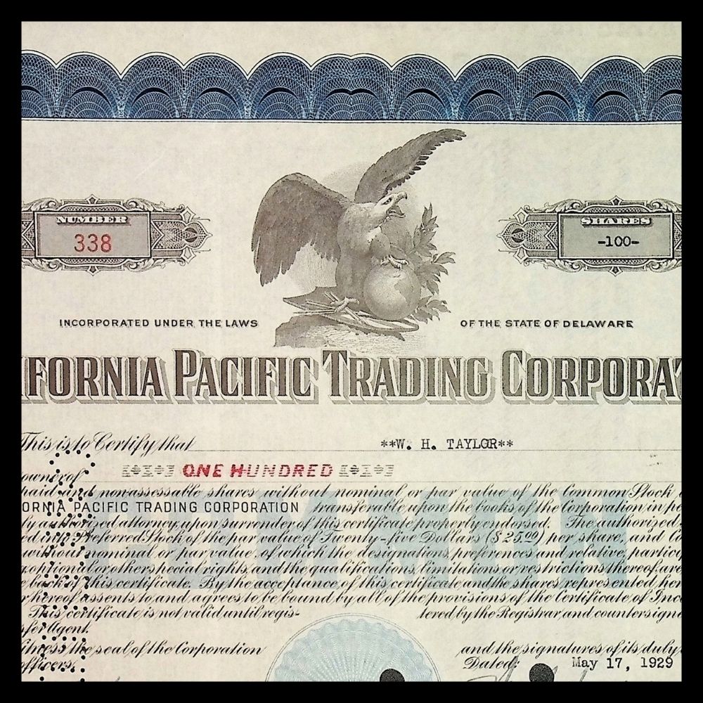 California Pacific Trading Corporation Stock Certificate from 1920s