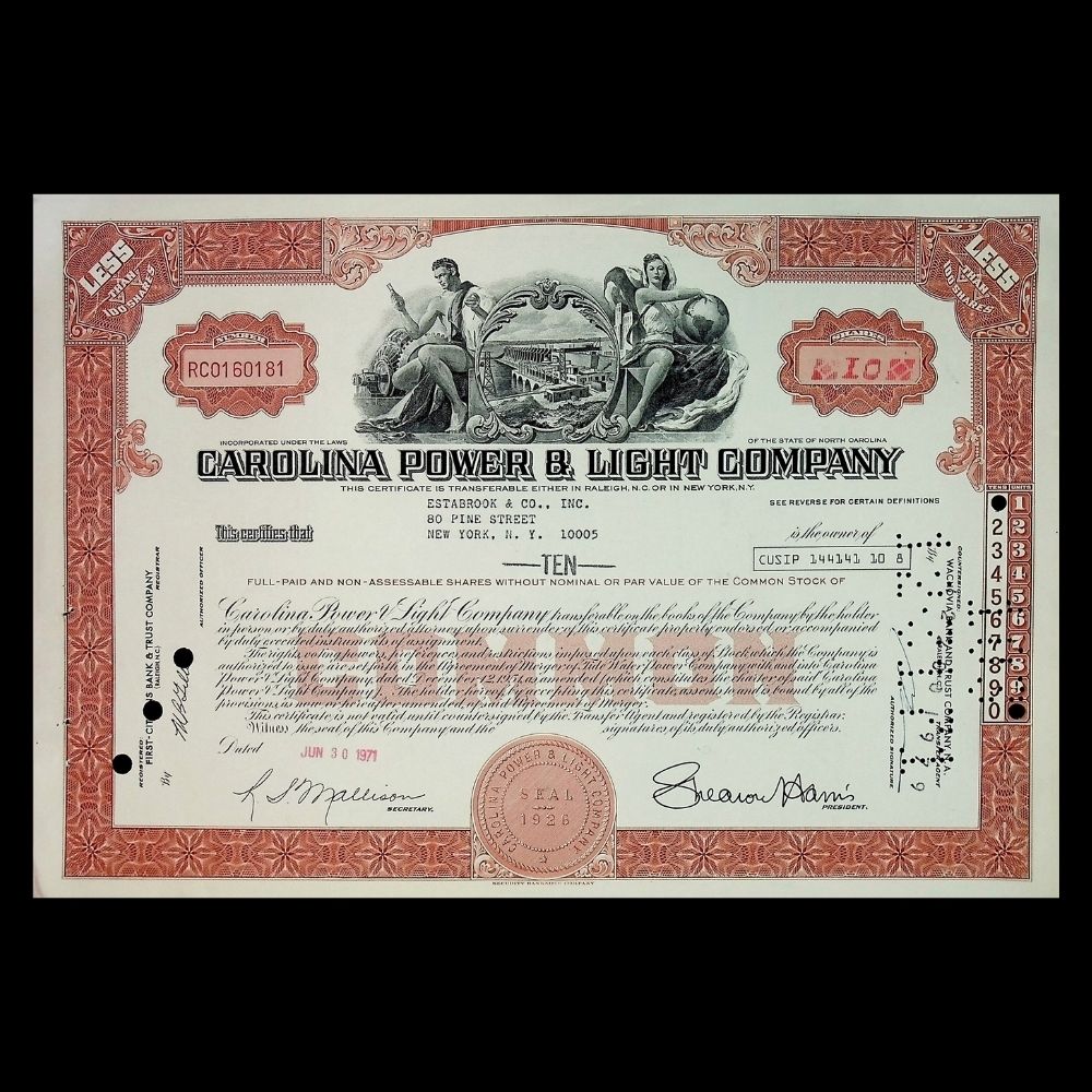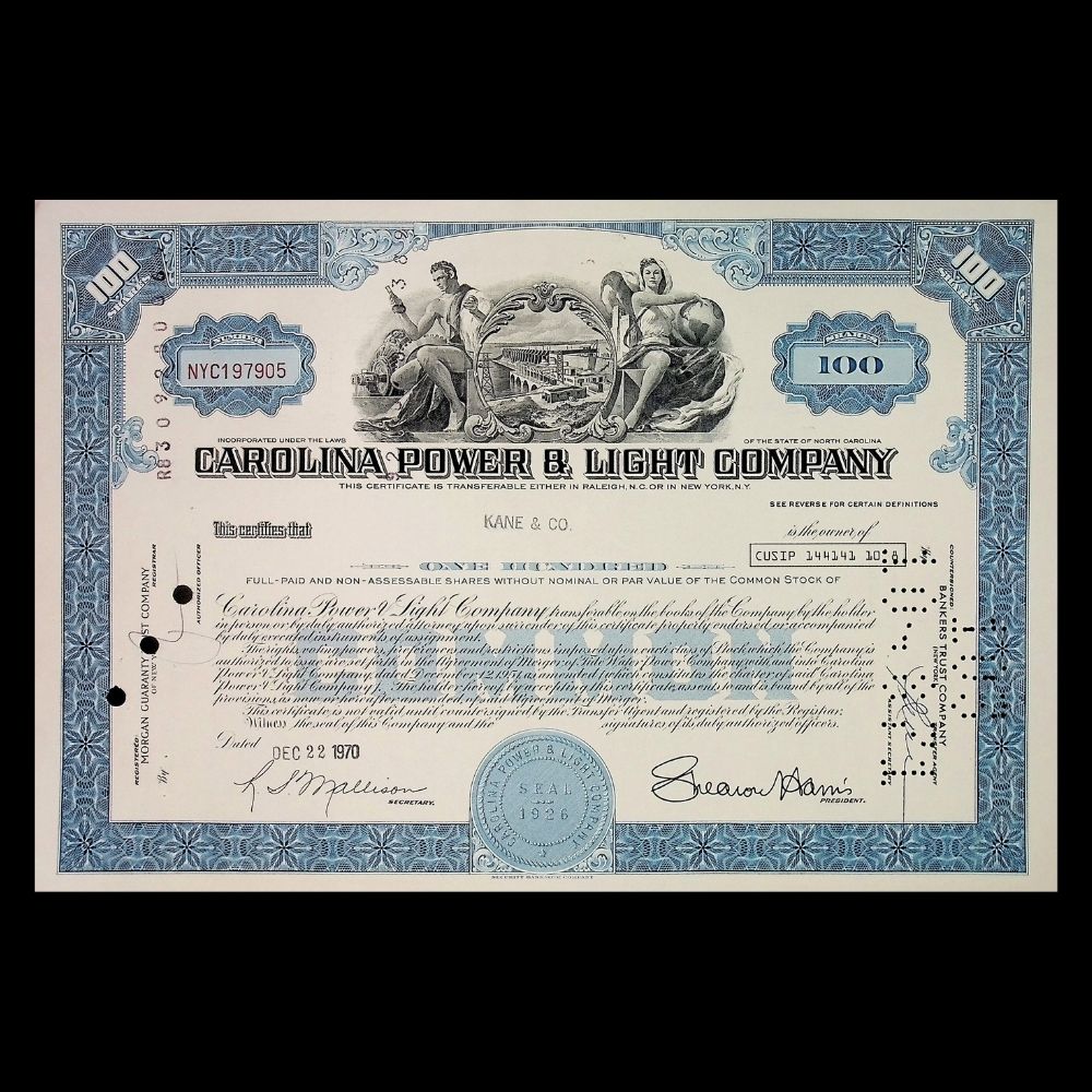 Carolina Power & Light Company (Duke Energy) Stock Certificate from 1970s