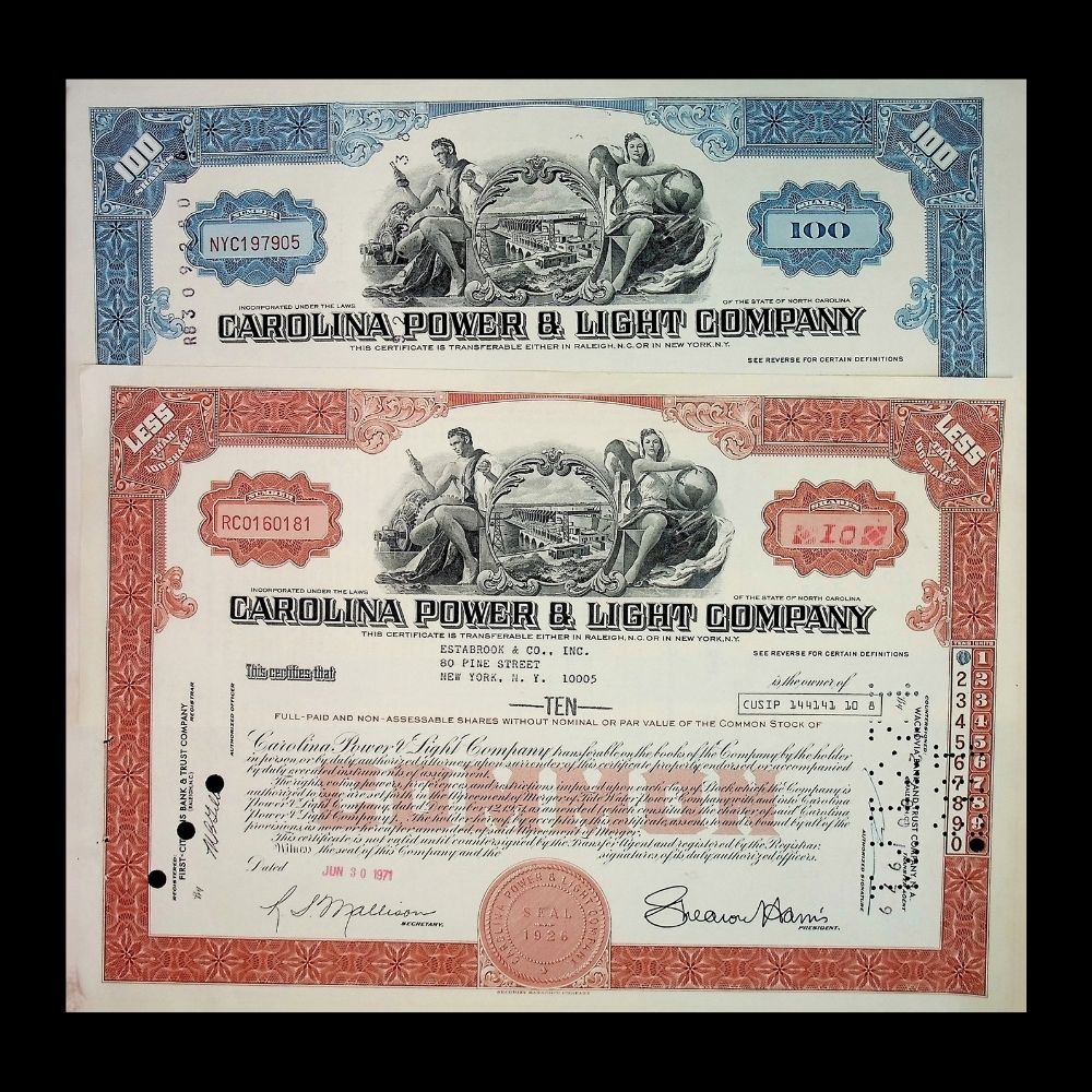 Your choice of red or blue Carolina Power & Light Company stock certificate from the 1970s, officially issued and cancelled. The certificate reflects a time when CP&L was expanding its electric utility service across eastern and western North Carolina (and into parts of South Carolina), during the era when nuclear power and regulated utility growth were central to its strategy.