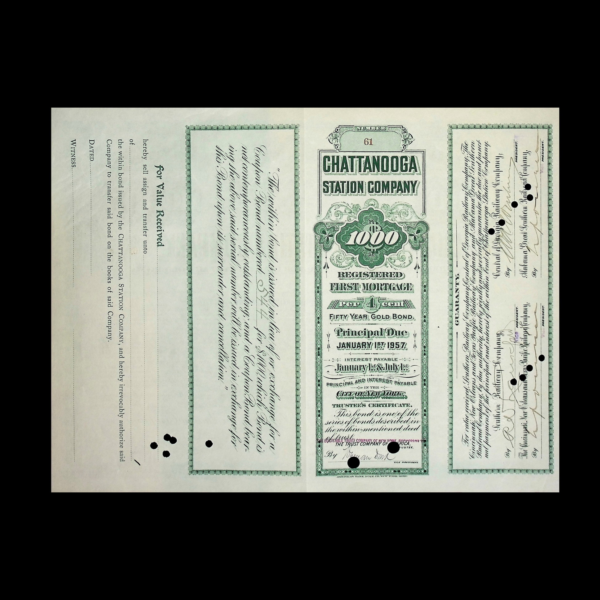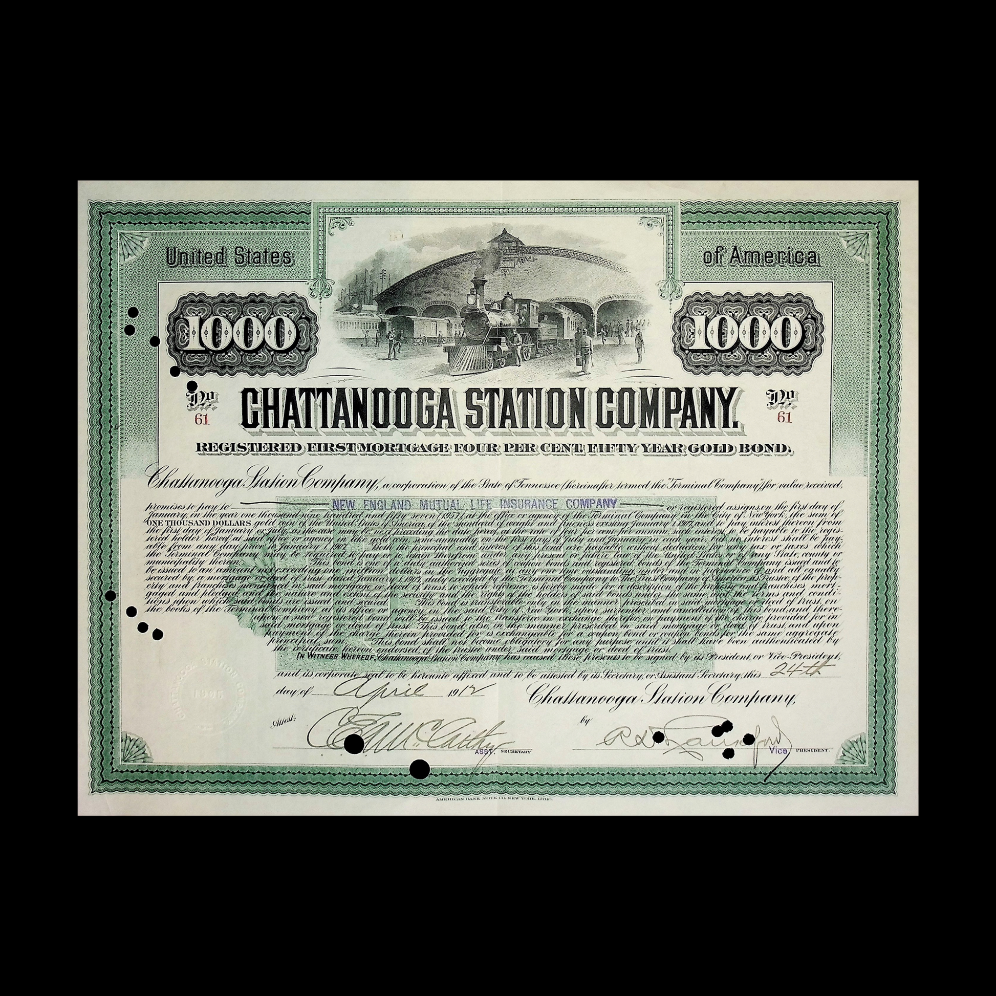 This is a Gold Bond certificate from the Chattanooga Station Company issued in 1912 for $1,000. Has signatures present. It has been cancelled, seen by the holes on the certificate.
